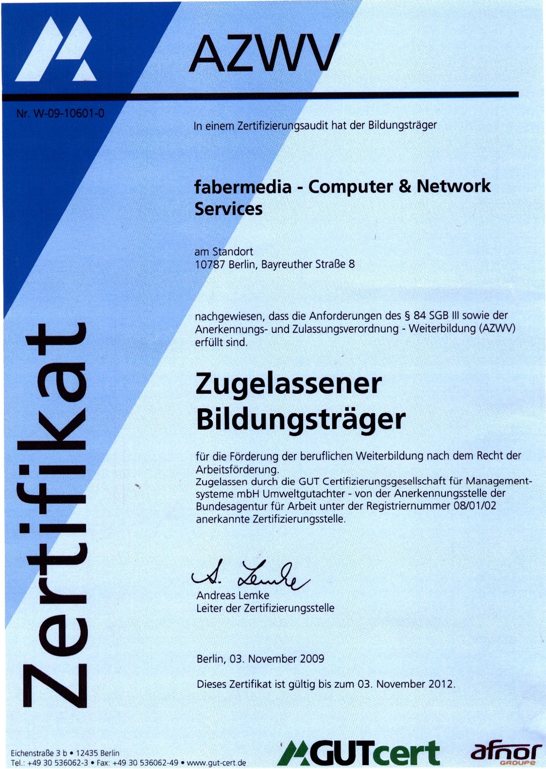 November 2009 | Erweiterung des Schulungsangebotes auf berufliche Weiter- und Fortbildung mit entsprechender Einführung eines QM-Systems und Zertifizierung des Unternehmens nach AZWV.